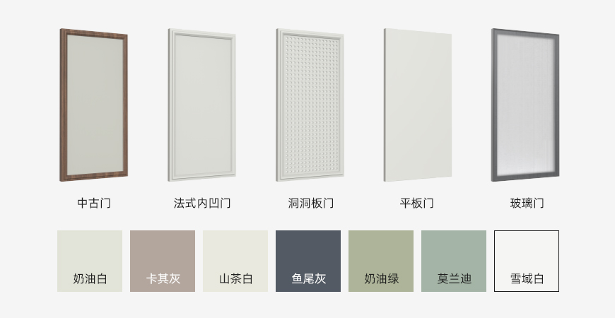 提供中古門、法式內(nèi)凹門、洞洞板門、平板門、玻璃門等五種門型,搭配7種高顏值配色,適配北歐、現(xiàn)代、輕奢等多種裝修風格。